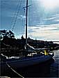 Jaja, det ska väl gå bra, det har ju blåst friskt hela veckan. Men, tyvärr, norr om Björkö när vi kommer tuffande dör vinden helt. Sol, vackert väder och vindstilla. Vi måttar ut en dödposition där vi absolut måste dra igång järngenuan (motorn) för att hinna in till ett, och slpannar av i solen